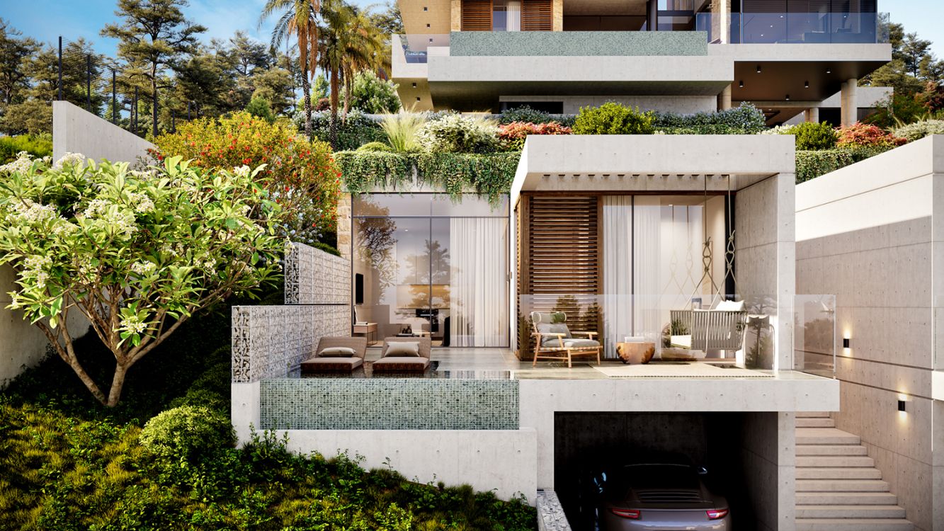 Designed as a family home for four, the residence is carefully embedded into the forested slopes, unfolding in two distinct layers. The main house, a composition of interlocking prismatic volumes, crowns the highest point of the site, framing panoramic views of the city and sea. Below, two subterranean one-bedroom studios emerge as extensions of the terrain, each with a private plunge pool, reinforcing the integration between architecture and landscape. A semi-floating pool projects outward, amplifying the sense of lightness and connection to the natural surroundings.