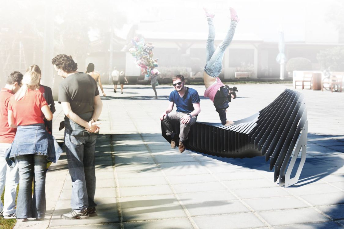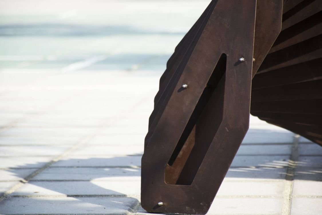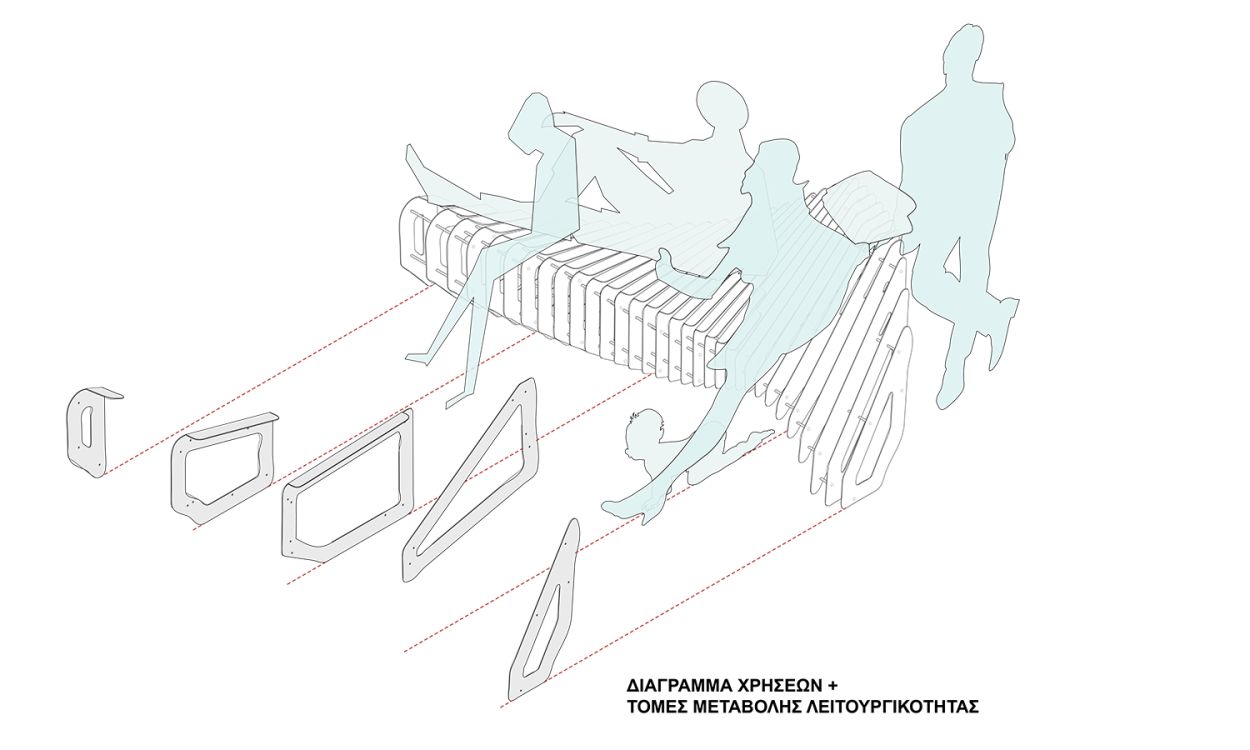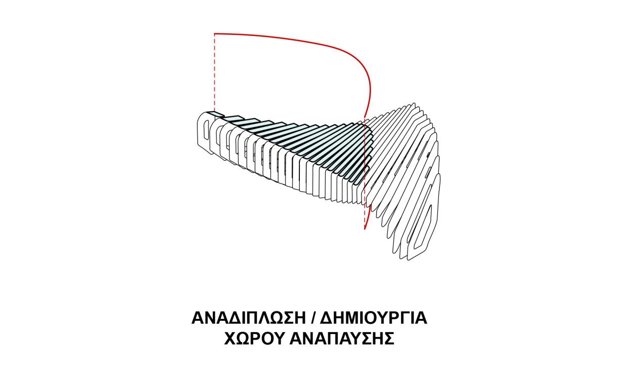 The proposal combines two phases of digital design and fabrication. At phase one all individual panels are cut using a laser cutter machine, while in second phase a bending machine is responsible for bending specified panels, creating the bench surface.