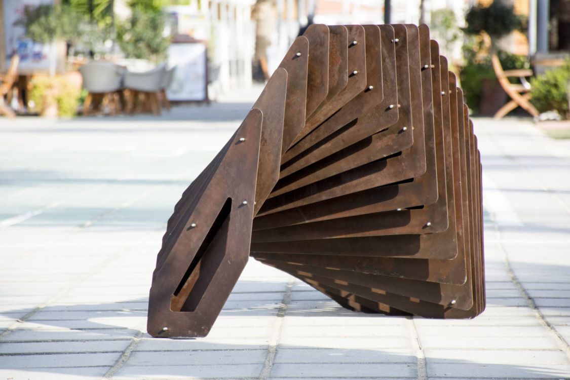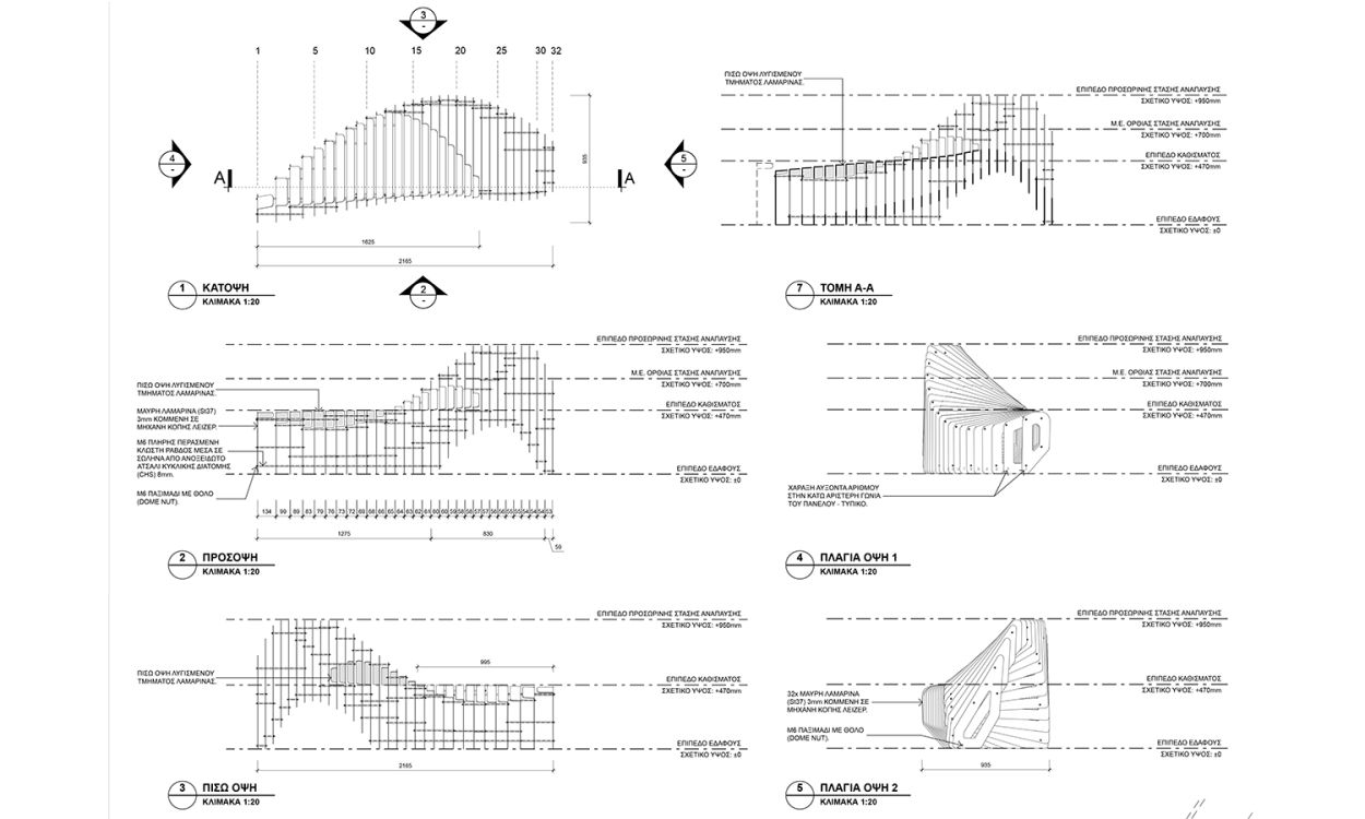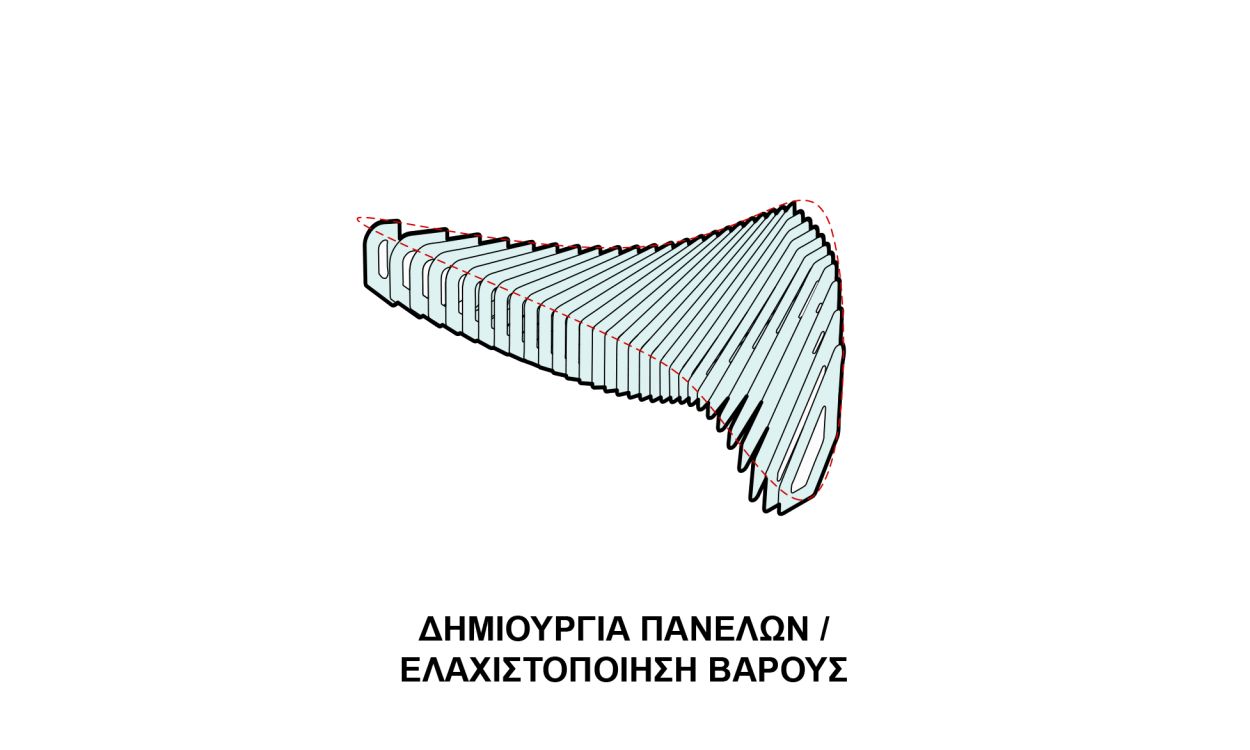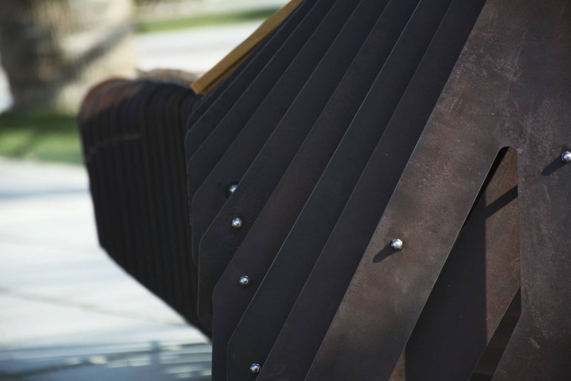 The proposal combines two phases of digital design and fabrication. At phase one all individual panels are cut using a laser cutter machine, while in second phase a bending machine is responsible for bending specified panels, creating the bench surface.