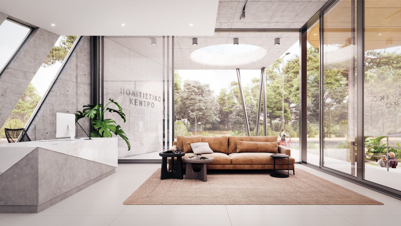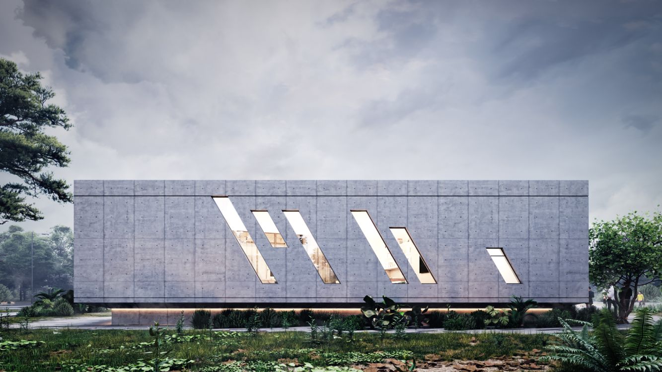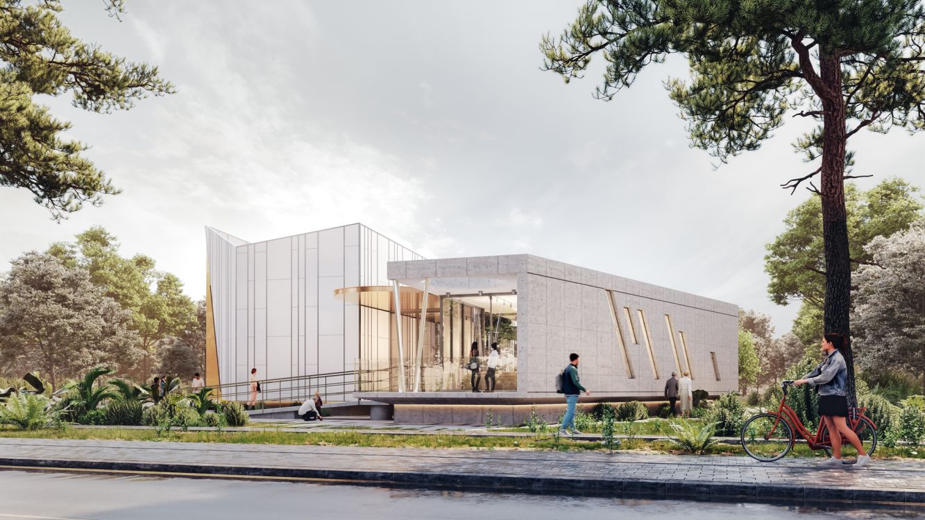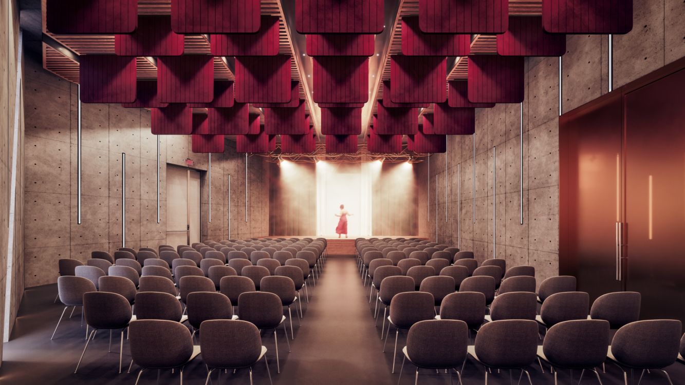 The building is designed to take on a new role where actions, arts, performances, events, experiences, and sensations must be constantly in full focus. It balances, between the “masculine”, austere, monolithic volume of exposed concrete, the Administration Building, and the “feminine”, elegant Event Hall, the heart of the Cultural Center. Clad in FCB and aluminum bronze panels, this irregularly shaped volume is developed with a choreographic intention and emphasis on the z-axis, with sharp uneven endings.
