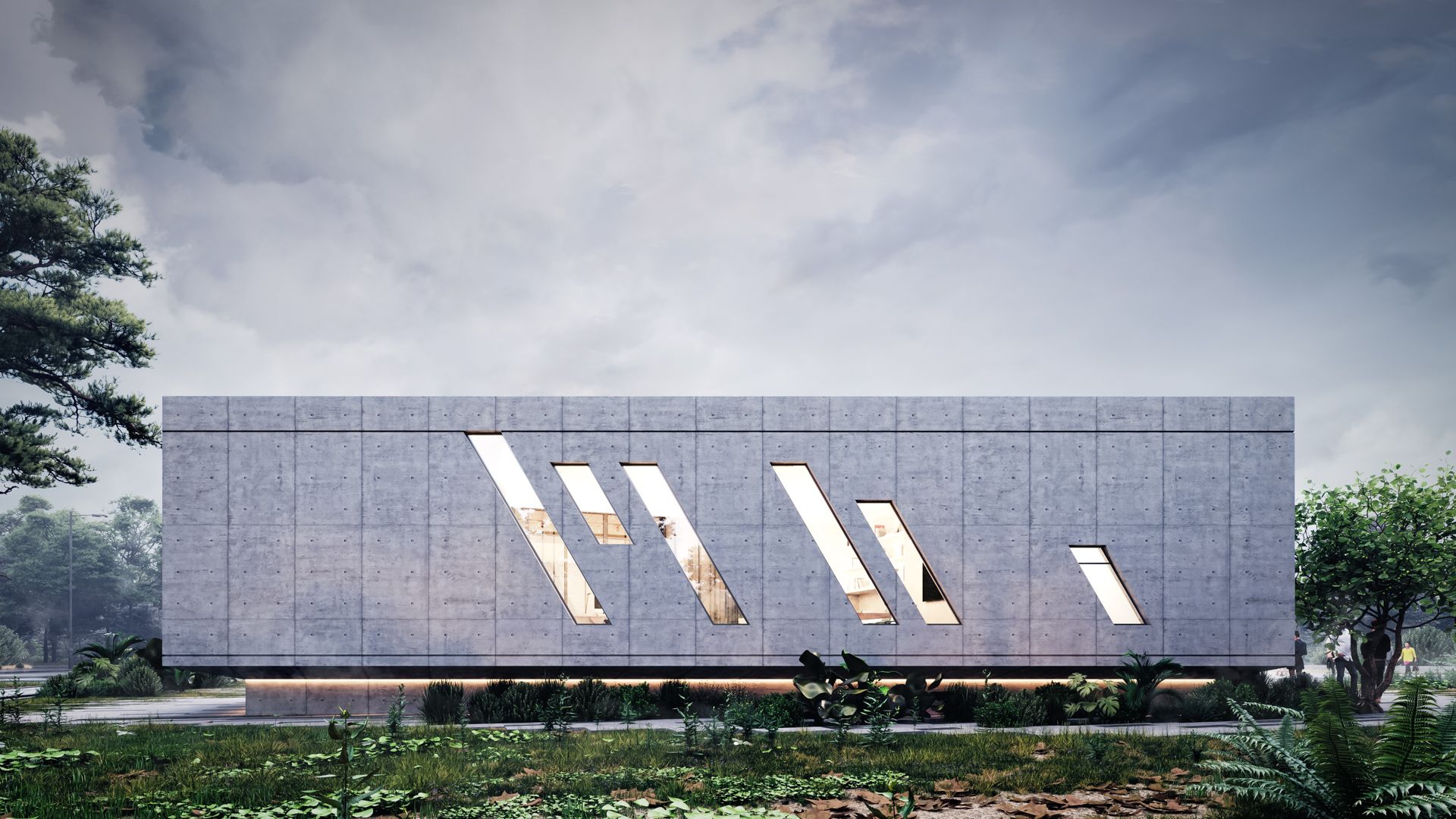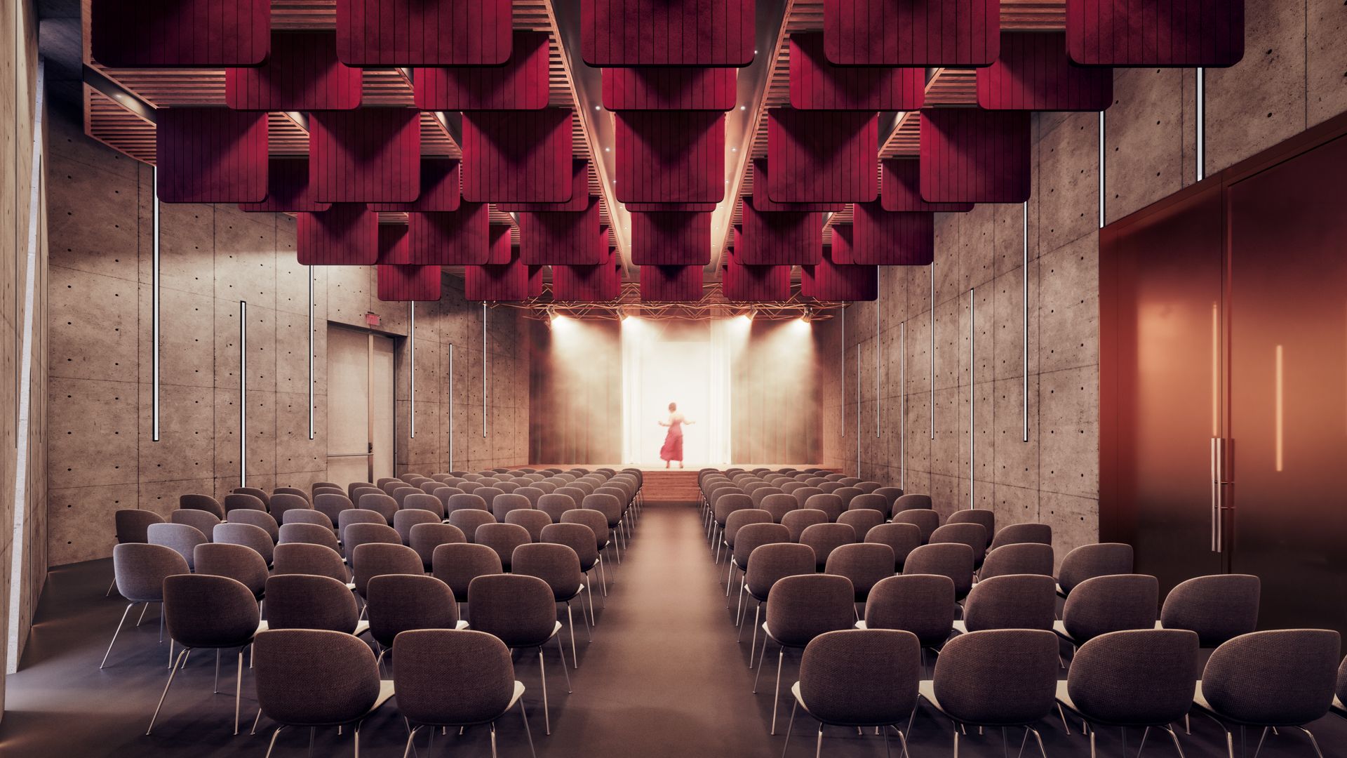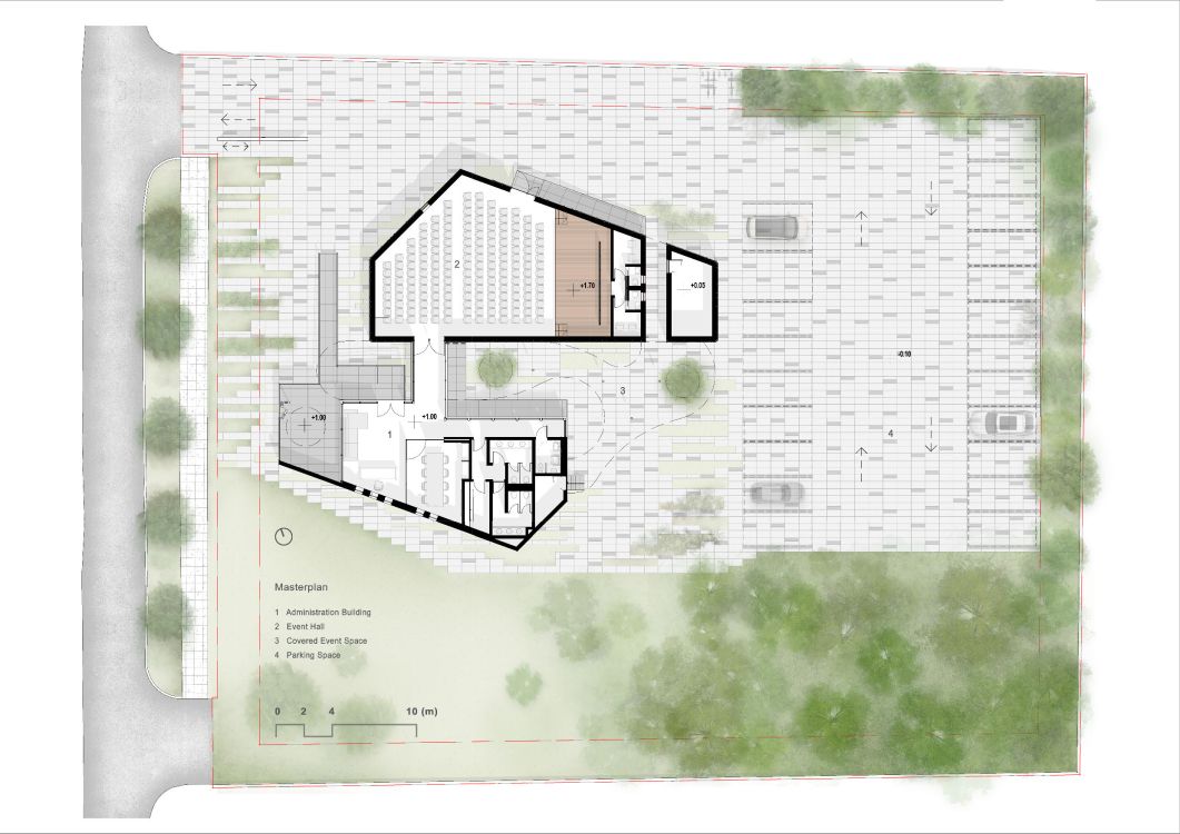 The building is designed to take on a new role where actions, arts, performances, events, experiences, and sensations must be constantly in full focus. It balances, between the “masculine”, austere, monolithic volume of exposed concrete, the Administration Building, and the “feminine”, elegant Event Hall, the heart of the Cultural Center. Clad in FCB and aluminum bronze panels, this irregularly shaped volume is developed with a choreographic intention and emphasis on the z-axis, with sharp uneven endings.
