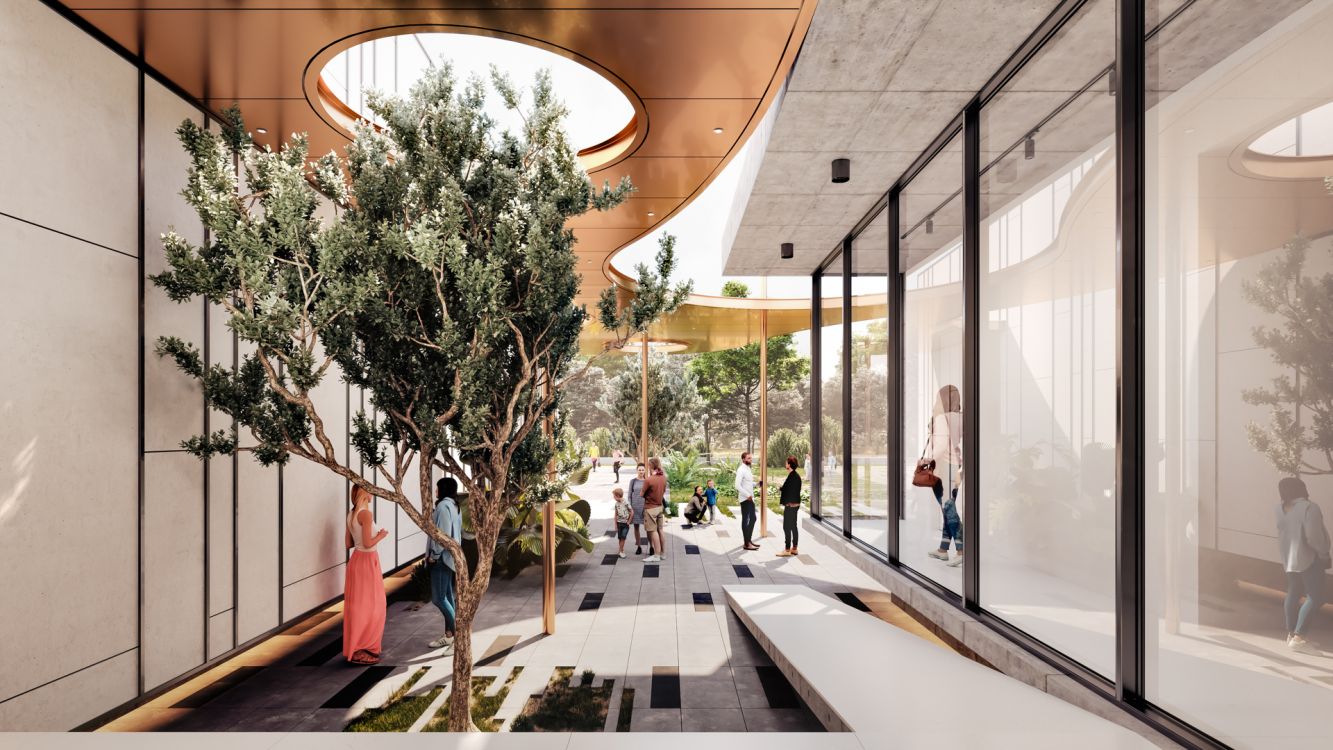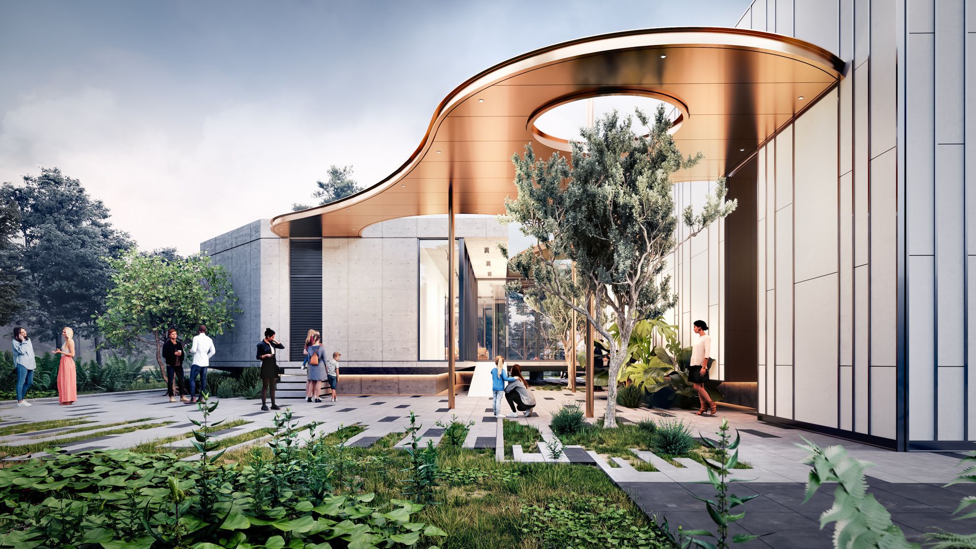 The intermediate outdoor space frames the “exterior events”, covered with the lightweight curvilinear canopy. Essentially, it creates theatricality – a single shape that bridges the two building volumes, imparting balance harmony and showmanship.