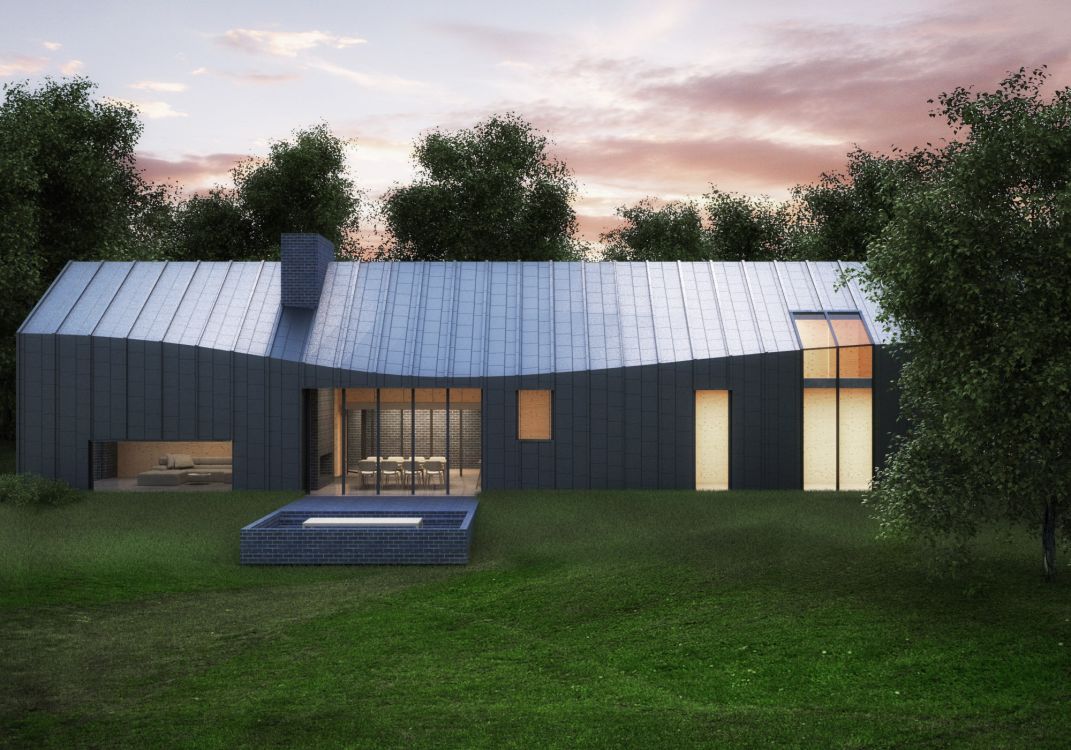 Both the charcoal colour and homogeneous design have minimal visual impact by removing the typical strong horizontal eave line and hence the change in material from roof to vertical walls.