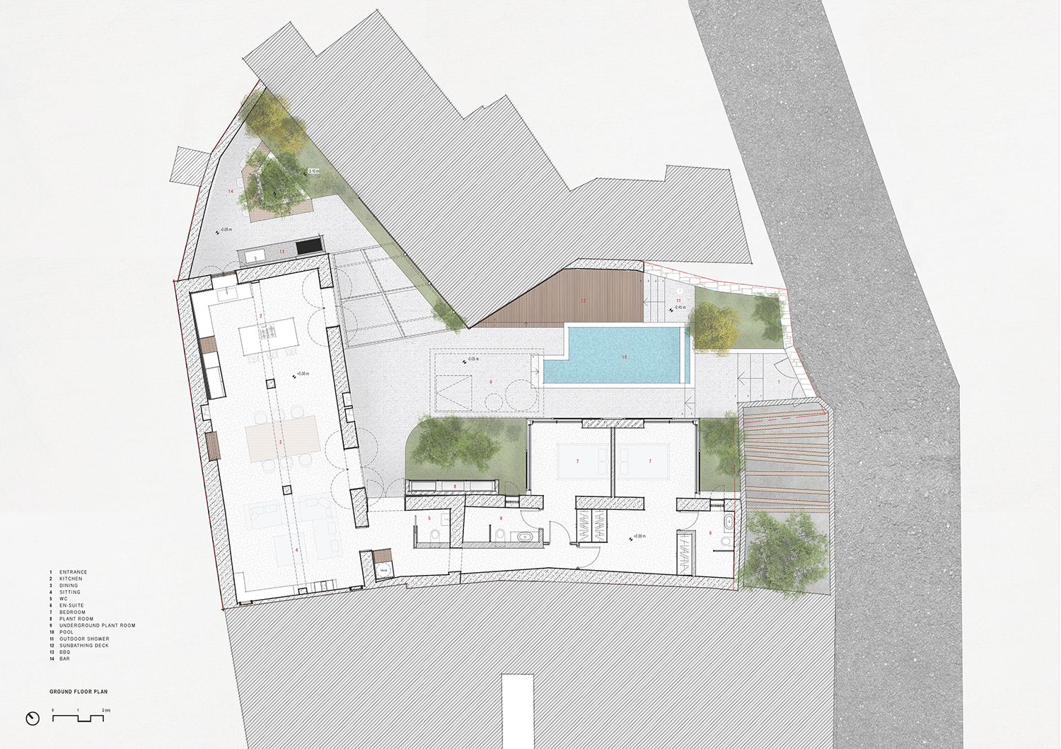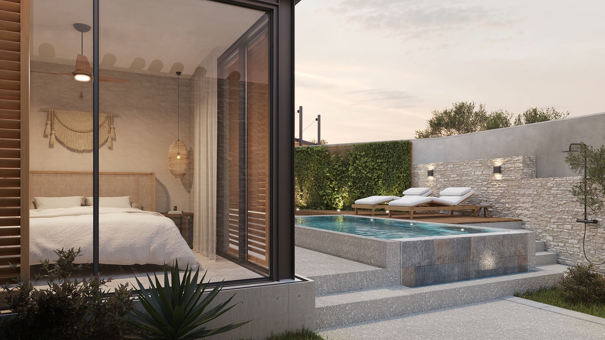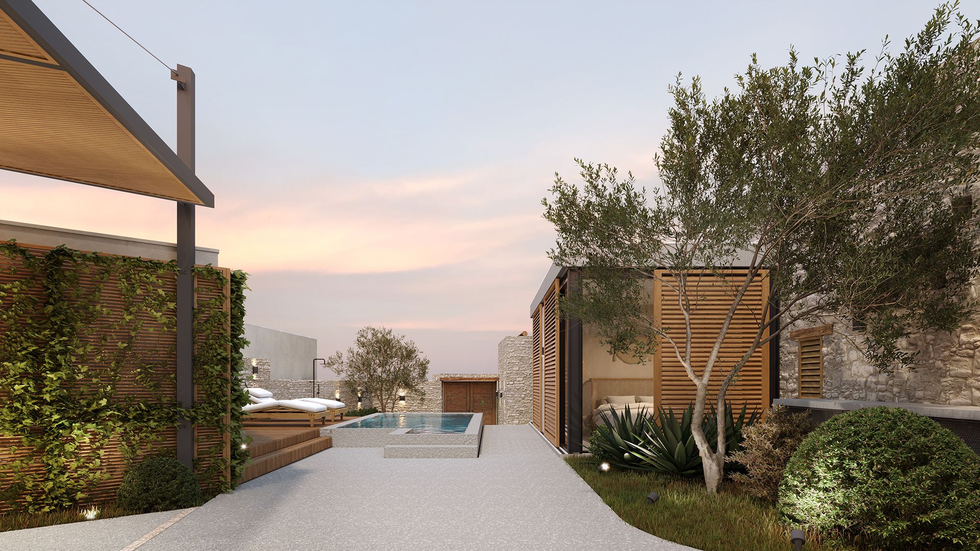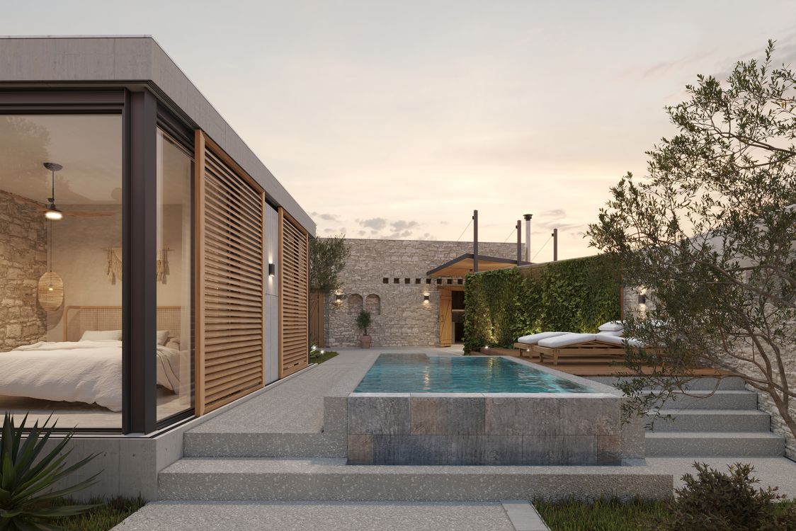 The outdoor courtyard in the centre of the plot, landscaped with olive trees and organised around a small pool, creates a dramatic focul point, entering from the front door. To the background, the NW wing of the building with an exposed traditional ceiling from round wooden beams and reeds, is inspired to deliver a cosy space that becomes the interconnection of the interior to the exterior, and year-round meeting space. The SW wing is configured to accomodate two large and confortable bedrooms with their ensuites. The bedrooms are partially housed in the new contemporary addition that is materially very different. The new space opens freely to the views, the courtyard with the landscape and the pool. Intentionally, it is kept visually light and open much like an elegant private shed constructed of steel and exposed concrete.