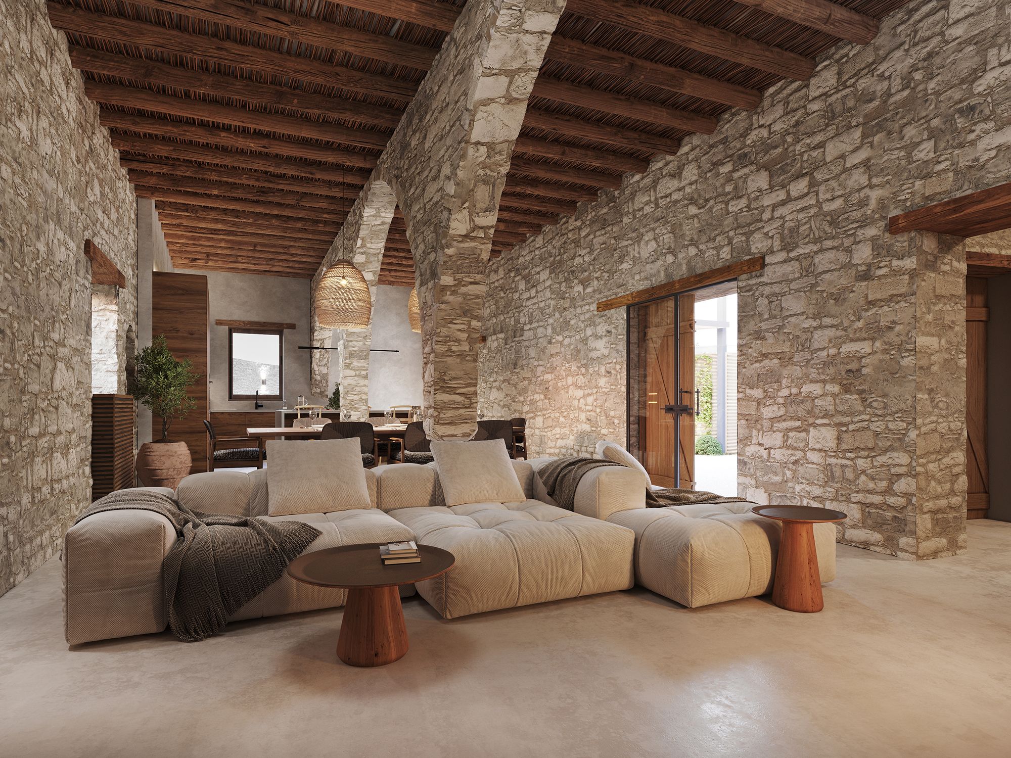 Little remained of the original stone house but its elegant proportions of the three stone arches with their featured cylindrical columns of hewn local stone.