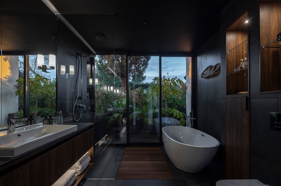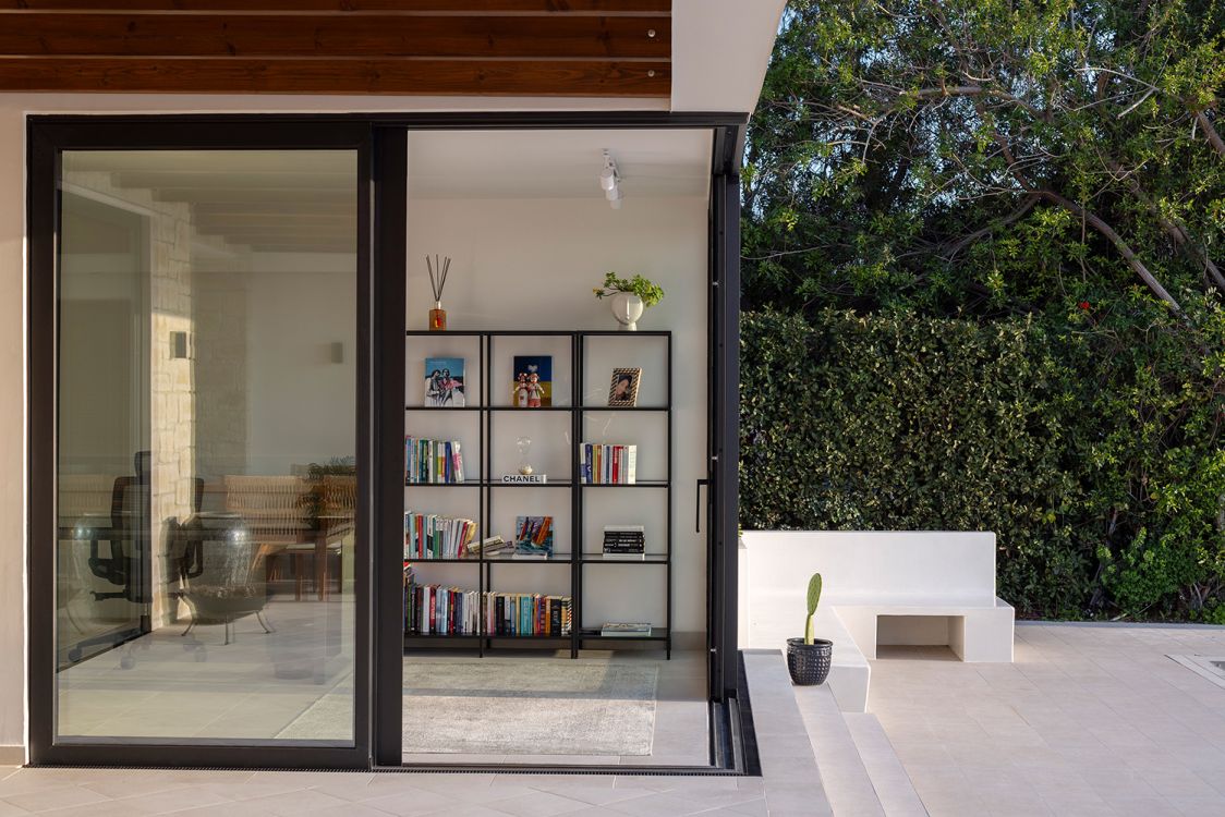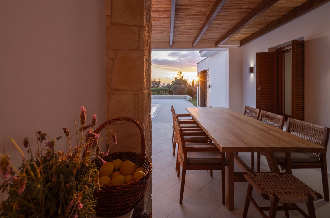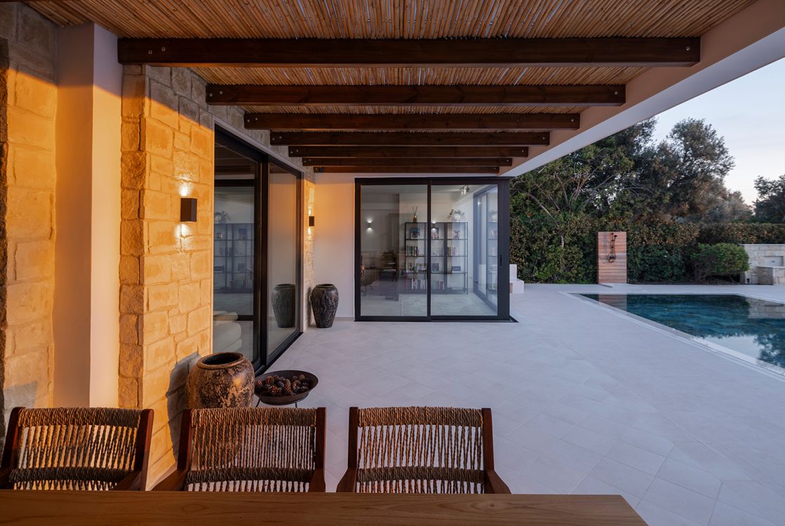 The material palette is natural and earthy. The front façade retains and restores the porphyry cobblestone flooring, emphasizing the car circulation area. The southwest façade preserves local Kivides stone, complemented by a reed-screened pergola that creates an evolving interplay of light and shadow. High-quality Italian ceramic flooring extends seamlessly between interior and exterior, reinforcing continuity and fluid movement.