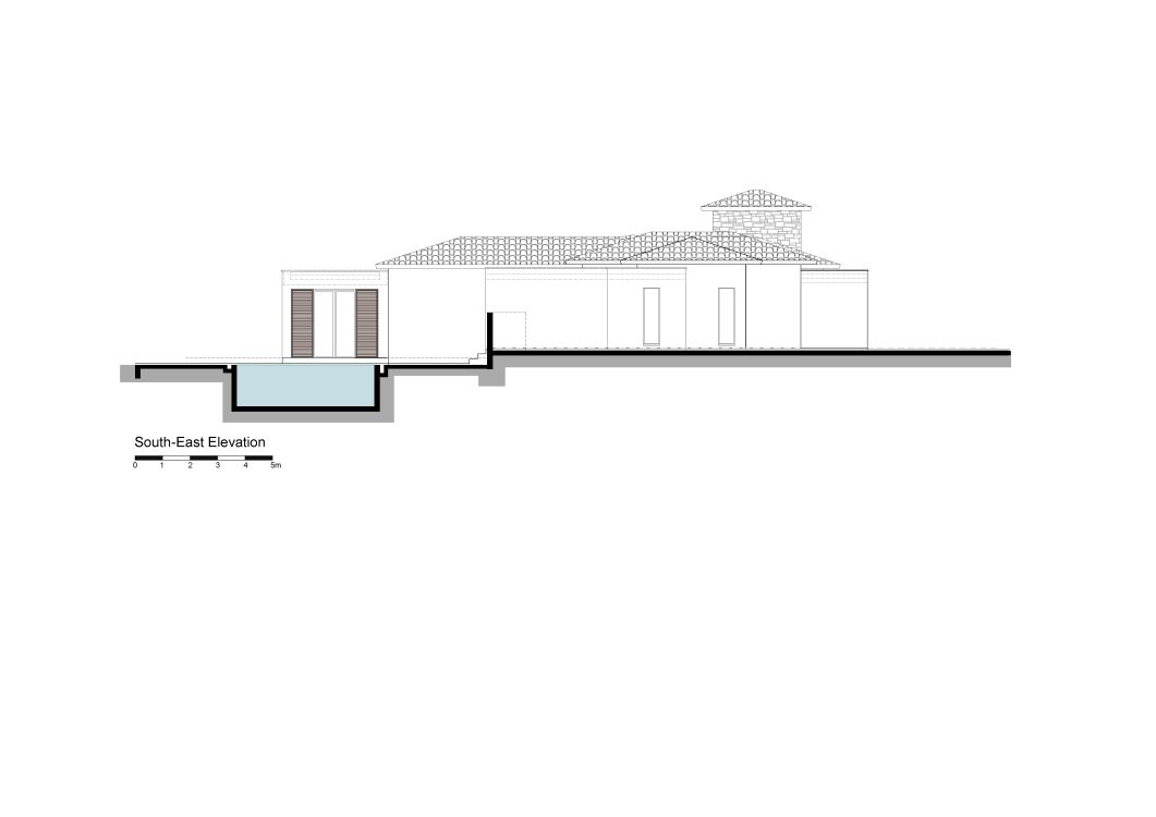 The villa’s extension is designed as a harmonious addition of volumes that retain their distinct identity. Three rectangular prisms are strategically arranged around the existing structure, incorporating the new bedroom to the west, the office with its en-suite bathroom to the south, and a redesigned entrance area to the northeast. Their clean geometry and flat roofs contrast with the original pitched roofs, creating a dynamic balance between old and new.