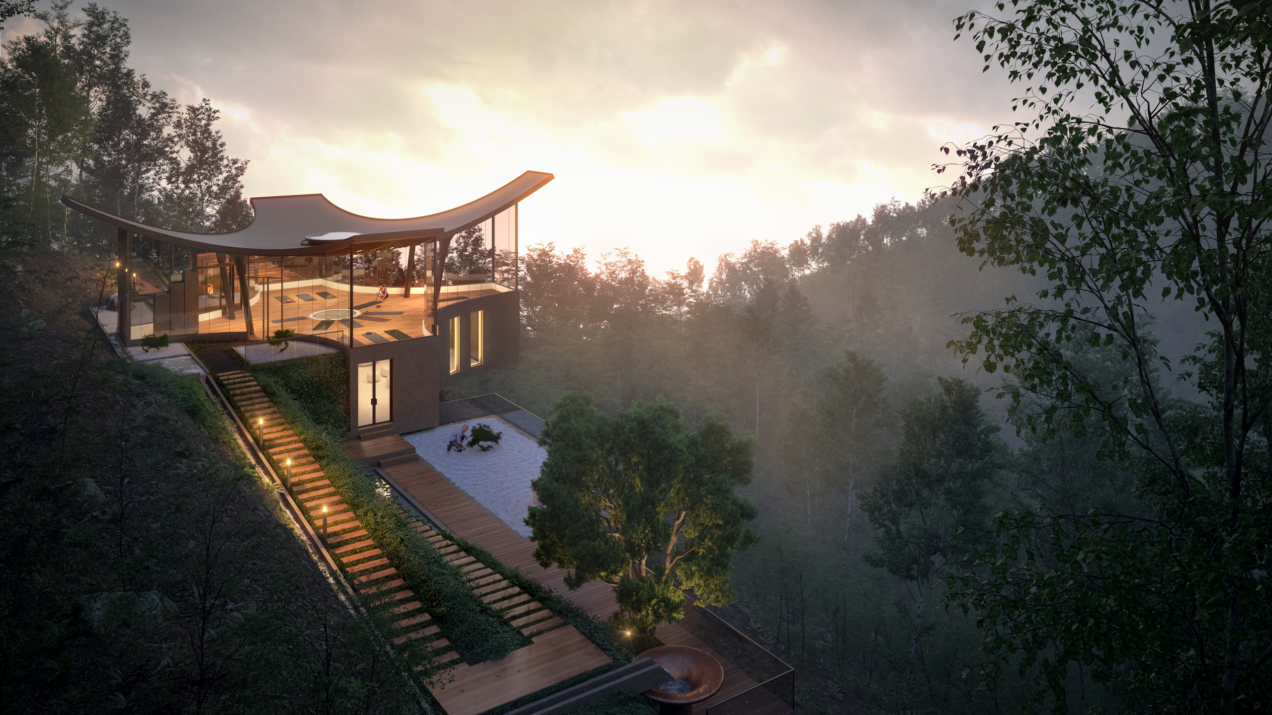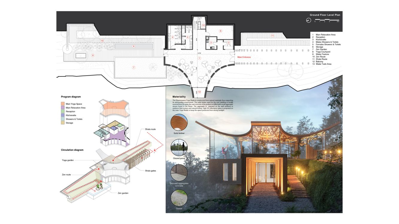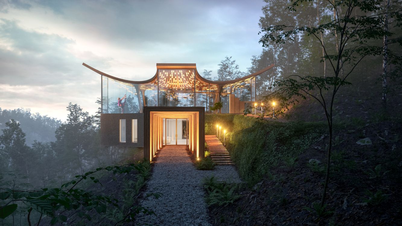 The building space is sculpted in the three-dimensional space, setting a visually dynamic area which is stimulated by the colors of nature that penetrate through the transparency of the glazed walls. The ancillary spaces are then attached underneath as a podium, a solid base which consists of raw and refined materials, forming the main entrance as well as actively supporting the main Yoga Space with relaxation spaces.