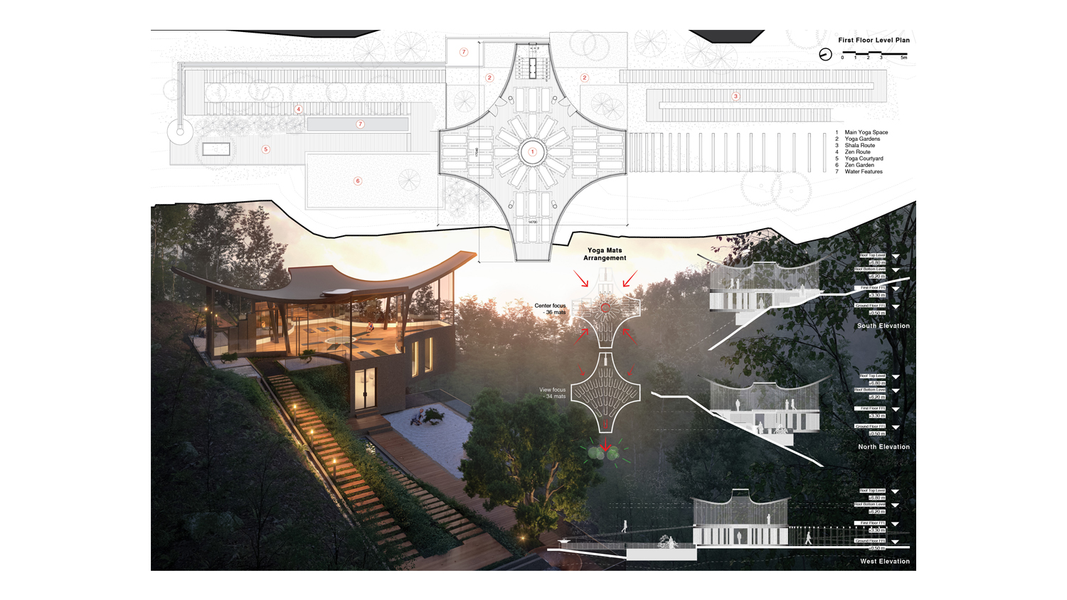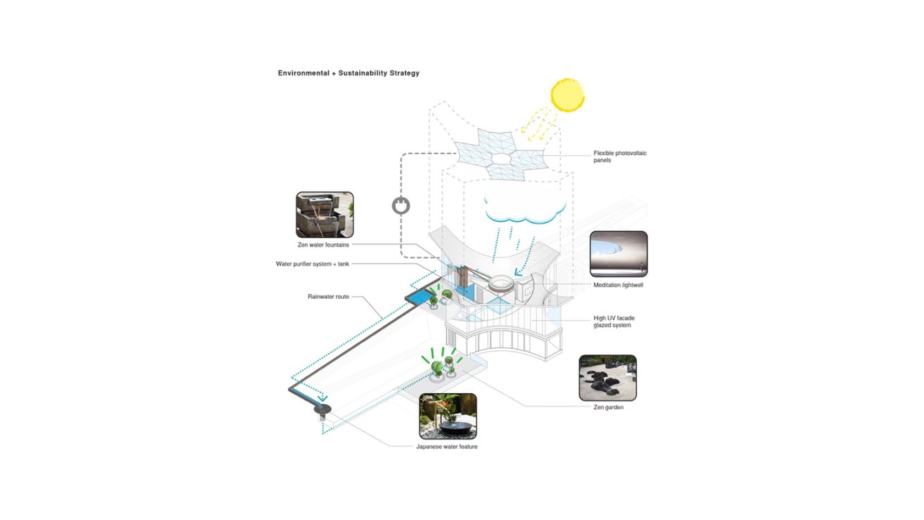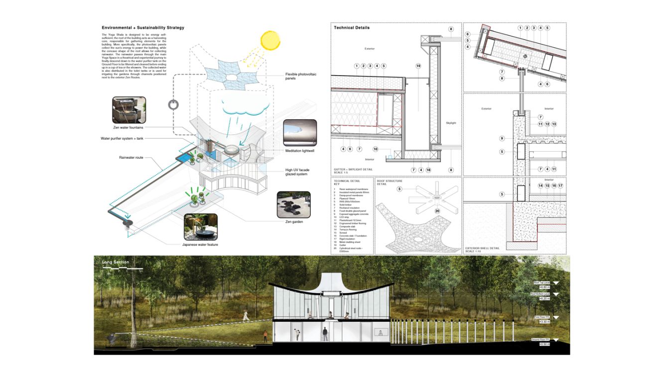 The yogi experiences a deeper connection with the environment, connecting with the flow and sound of the rainwater which is revealed internally, coming from the roof onto the top of the three podiums, which stand in the middle of the staircase. From there, the water is directed to the exterior Yoga Gardens. Then, through a channel, it flows to the Zen Garden at the lower level, following the direction of a stepping ramp at the north-east side of the building, the Zen Route.