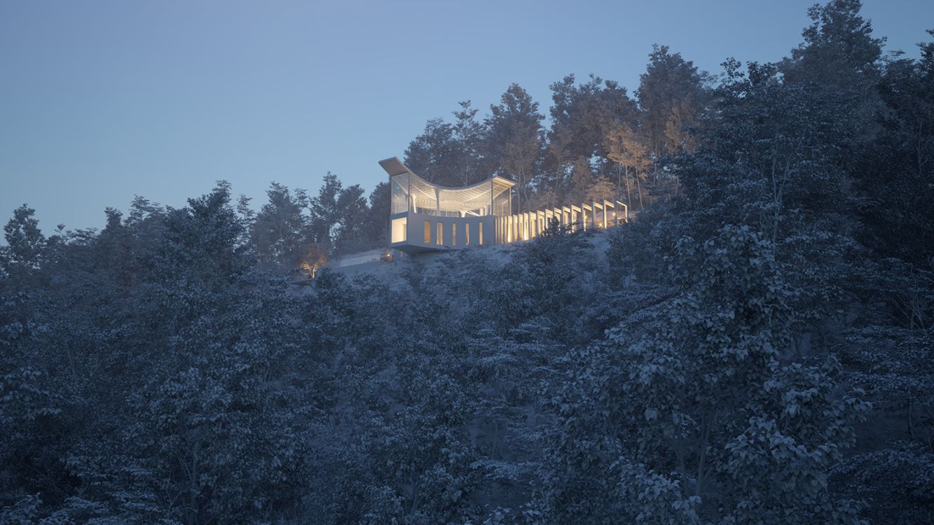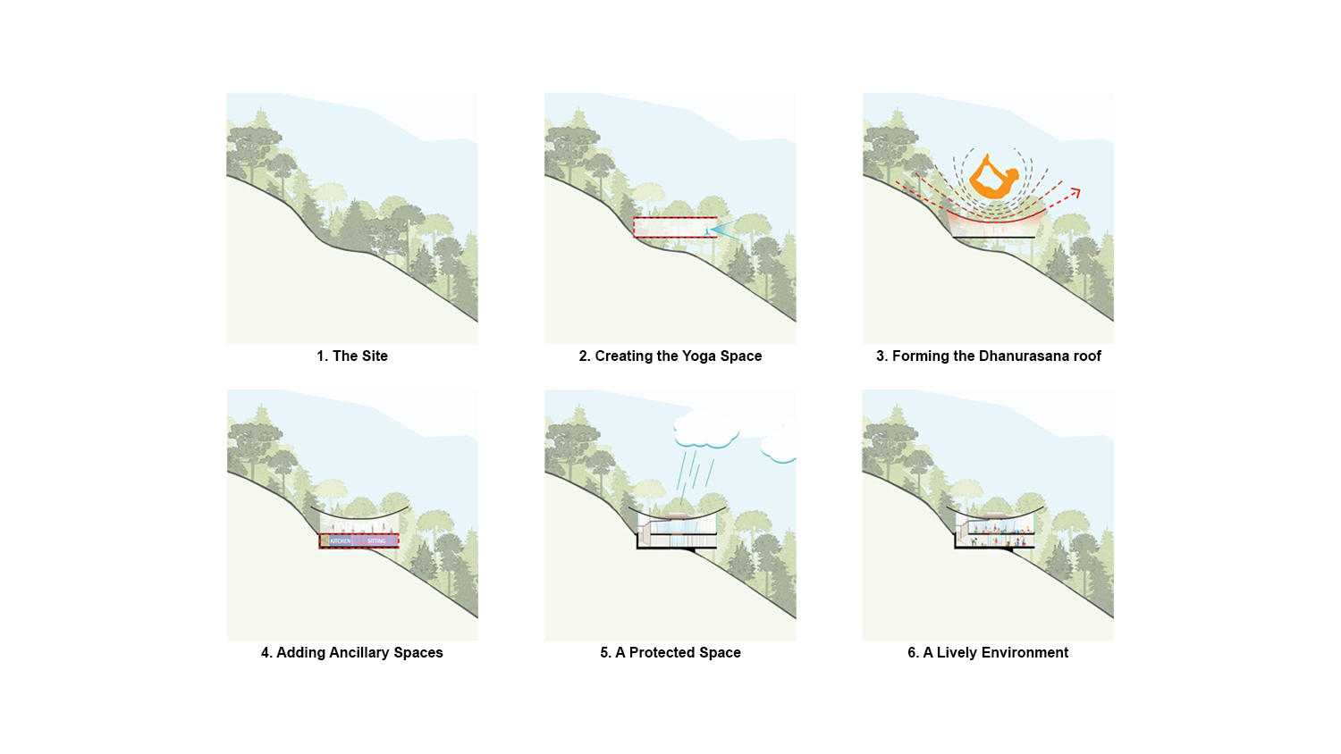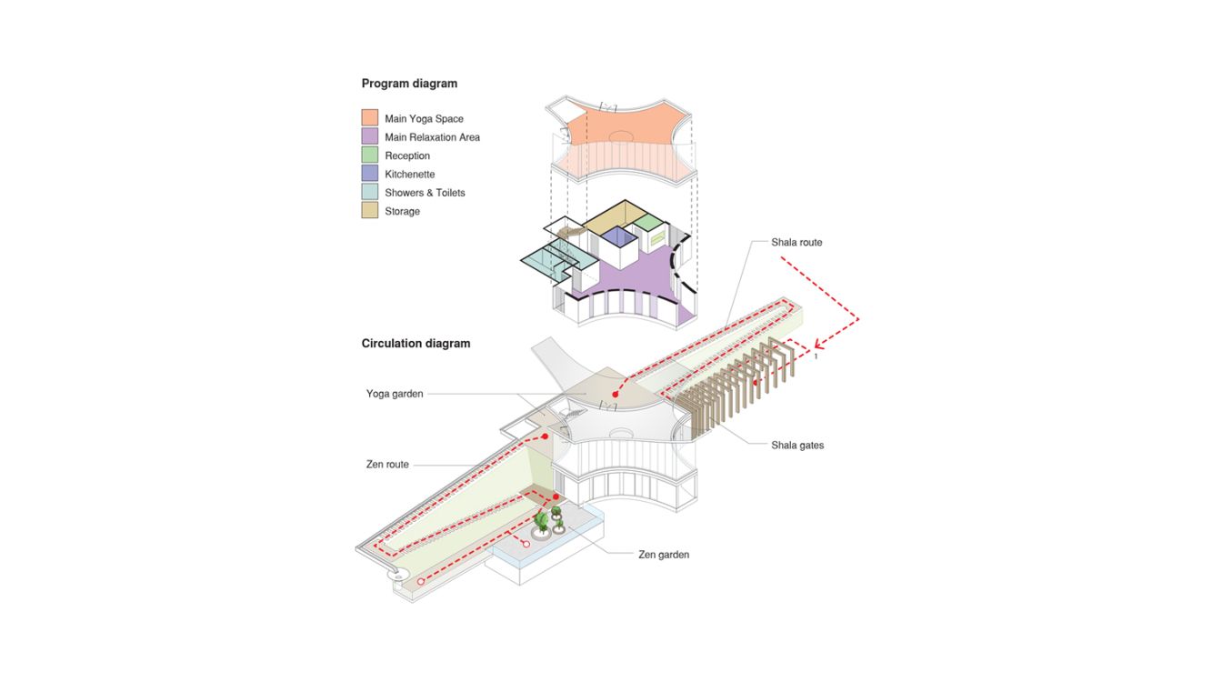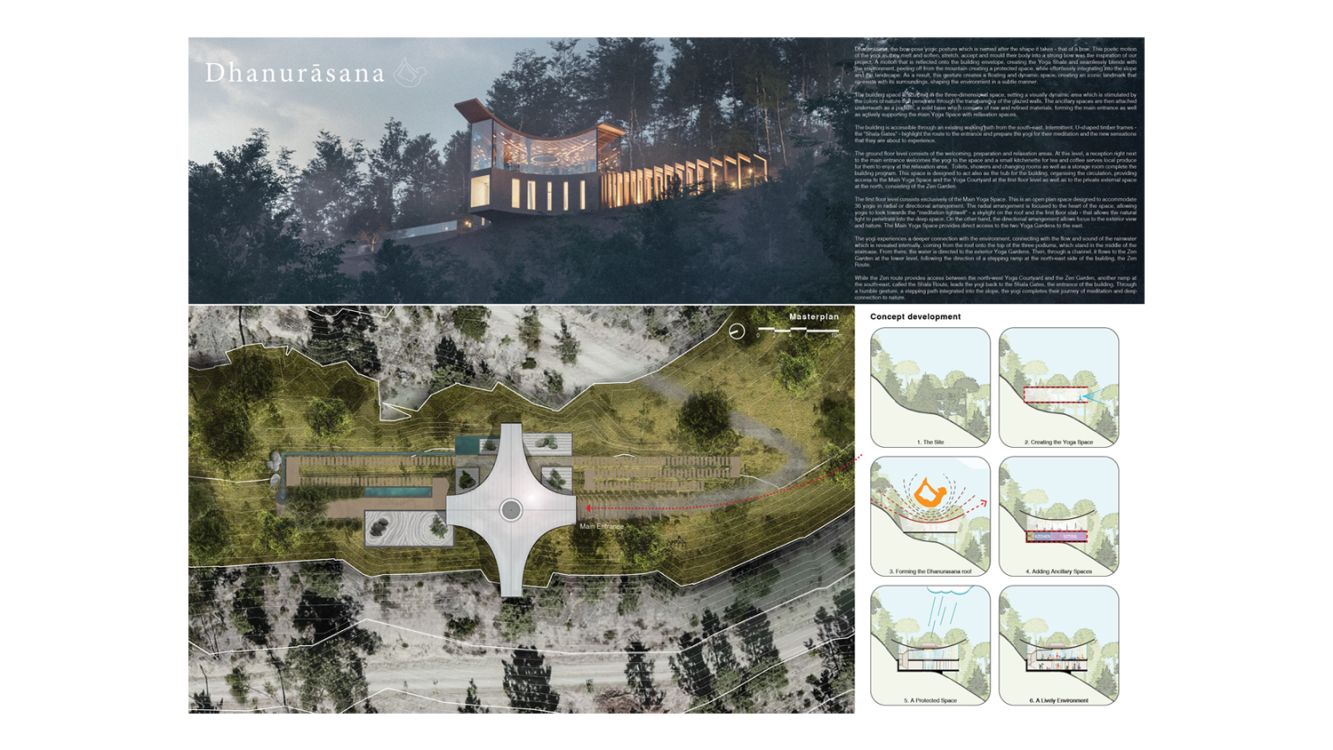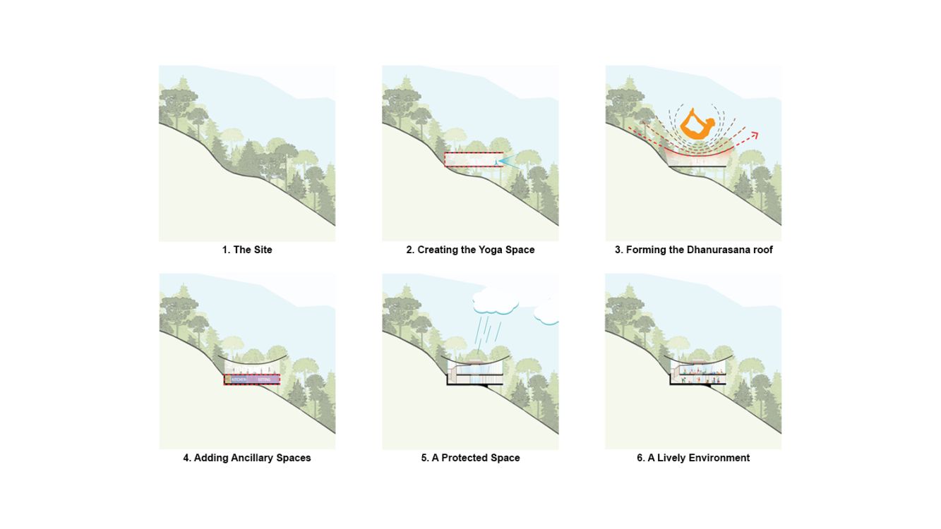 Dhanurasana, the bow-pose yogic posture which is named after the shape it takes - that of a bow. This poetic motion of the yogi as they melt and soften, stretch, accept and mould their body into a strong bow was the inspiration of our project. A motion that is reflected onto the building envelope, creating the Yoga Shala and seamlessly blends with the environment, peeling off from the mountain creating a protected space, while effortlessly integrating into the slope and the landscape. As a result, this gesture creates a floating and dynamic space, creating an iconic landmark that co-exists with its surroundings, shaping the environment in a subtle manner.
