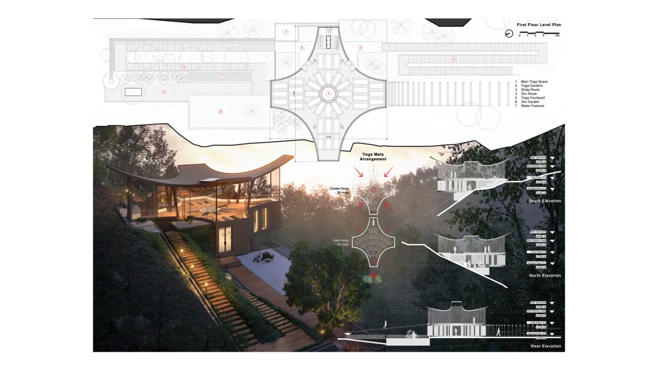 The first floor level consists exclusively of the Main Yoga Space. This is an open plan space designed to accommodate 36 yogis in radial or directional arrangement. The radial arrangement is focused to the heart of the space, allowing yogis to look towards the "meditation lightwell" - a skylight on the roof and the first floor slab - that allows the natural light to penetrate into the deep space. On the other hand, the directional arrangement allows focus to the exterior view and nature. The Main Yoga Space provides direct access to the two Yoga Gardens to the east.