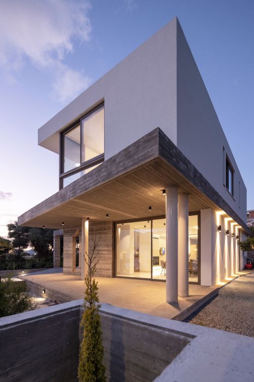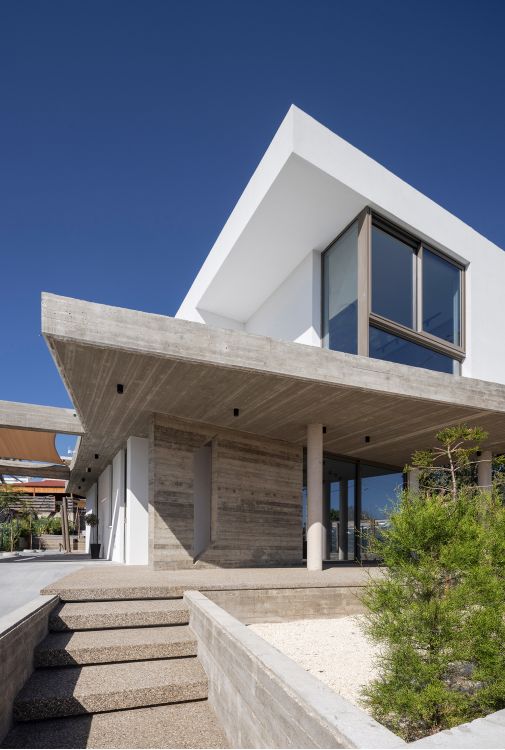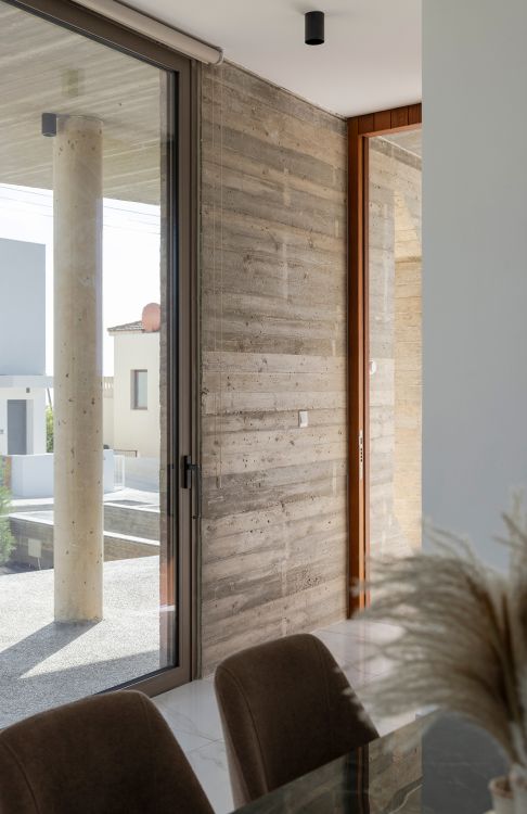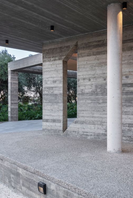 The upper floor follows the same axis and hosts the private quarters. A horizontal board-formed concrete slab is inserted between the two levels, acting as both a structural and compositional gesture. Extending outward to form a covered veranda supported by cylindrical columns, it lends the house a sense of suspension and spatial rhythm.